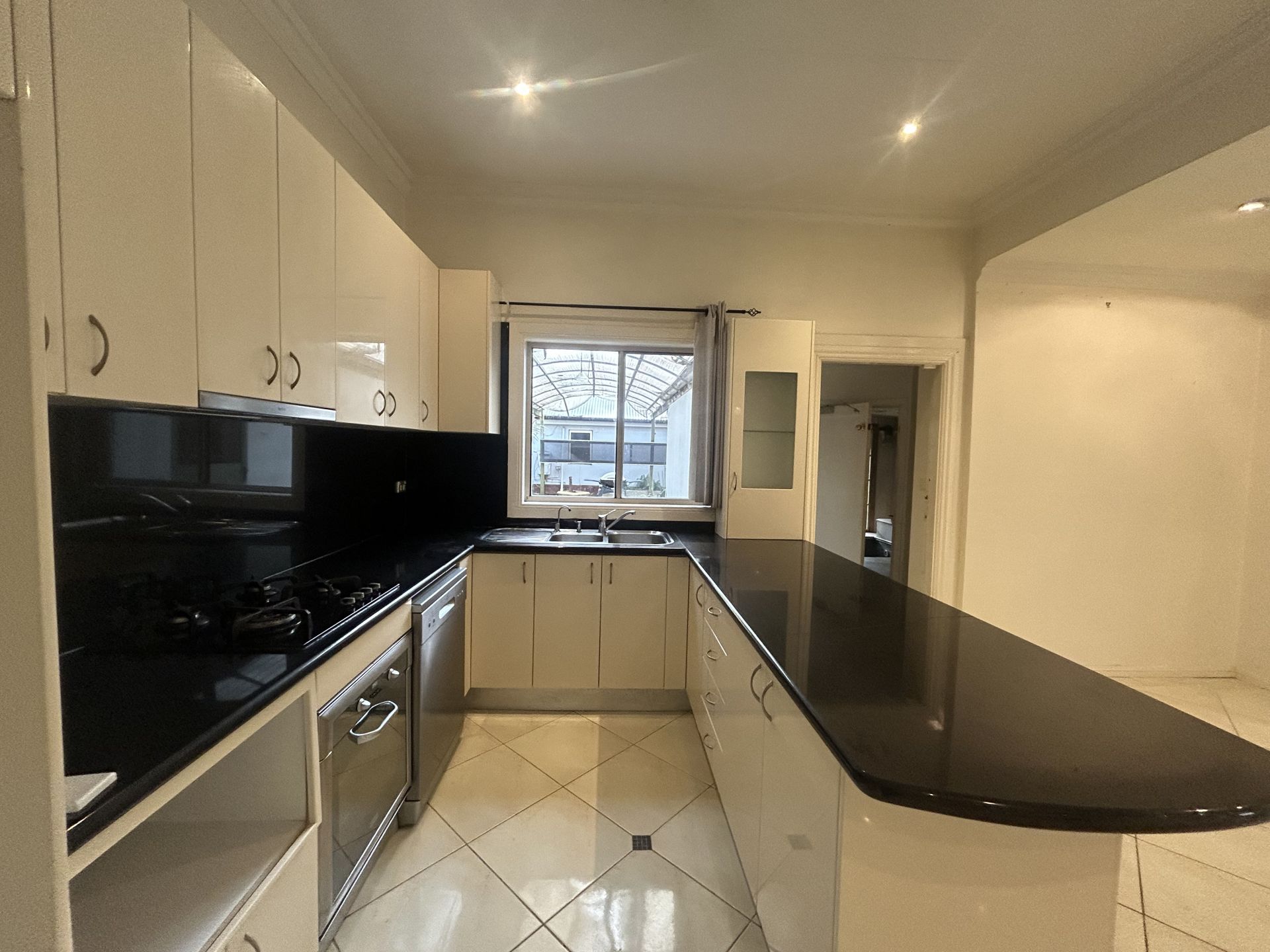Modern kitchen with stone benchtops and gas cooking. Plenty of cupboard space.