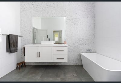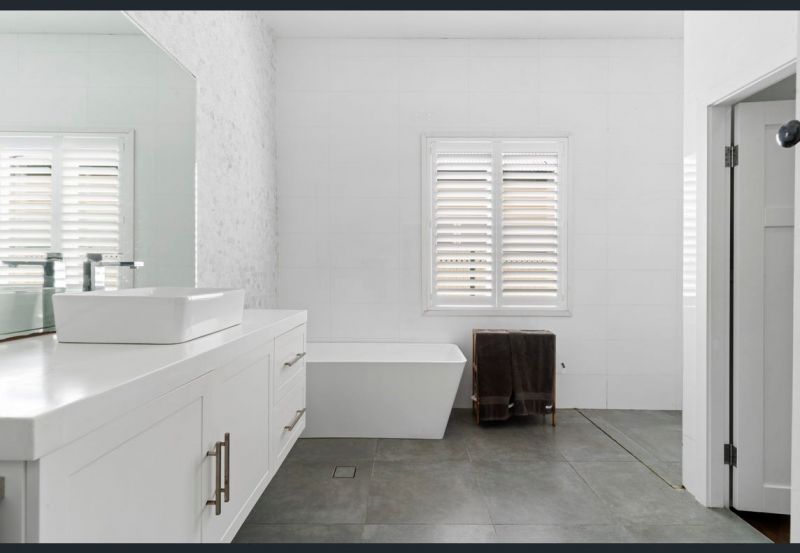 - A stylishly renovated bathroom featuring a freestanding bathtub