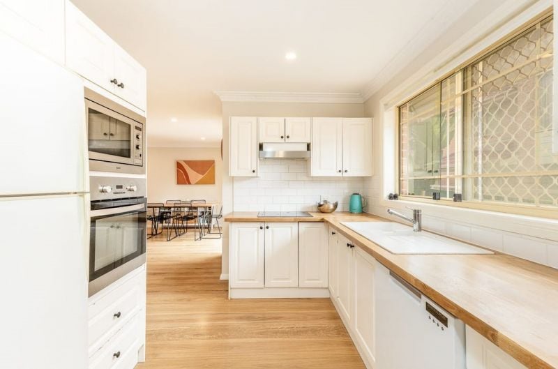 - Well-maintained modern kitchen with timber bench, double sink and plenty of storage and bench space