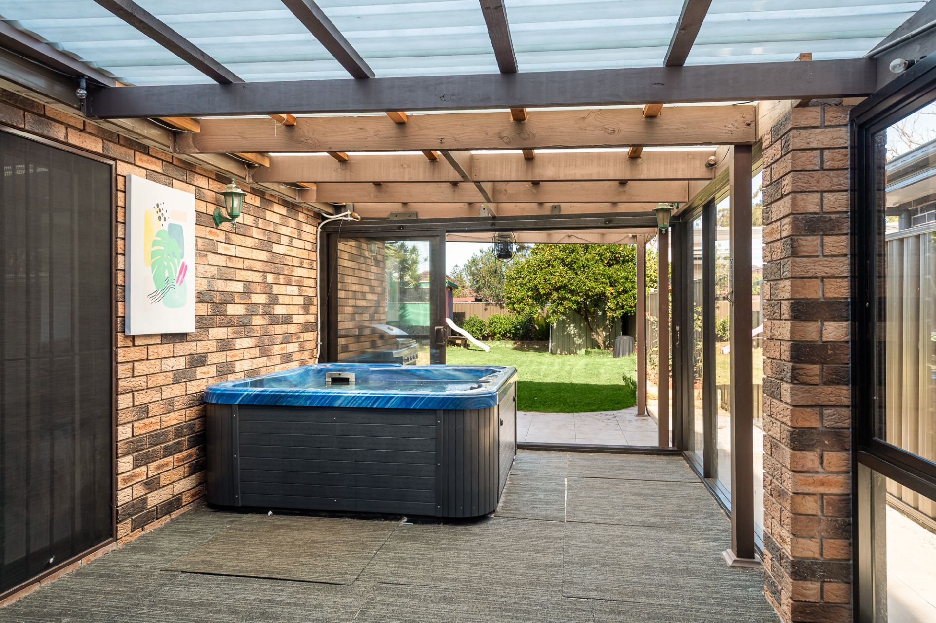 The generous living room features a bay window overlooking the front garden and flows seamlessly into the open plan kitchen and dining area. Perfect for entertaining, the dining space accommodates large gatherings and connects to a well equipped kitchen with Caesarstone benchtops, a breakfast bar, glass splashback and abundant storage. The kitchen opens out to a covered pergola complete with a spa, ideal for year round enjoyment.