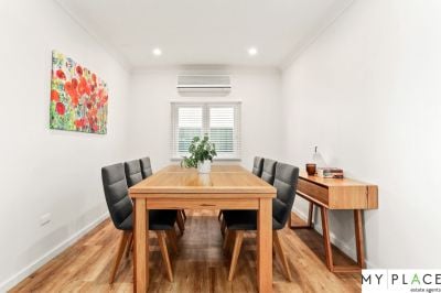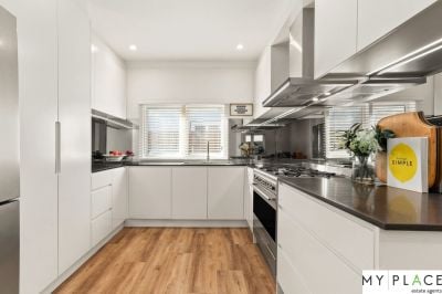 The home begins with four spacious bedrooms, each featuring built-in wardrobes. At the rear of the home, two renovated bathrooms offer modern finishes, with one including a bathtub. Moving through, you'll find an immaculate gas kitchen with premium appliances and stone countertops, flowing seamlessly into a separate formal dining room. The expansive open-plan living area boasts abundant natural light, with large windows and a cozy atmosphere perfect for family living.