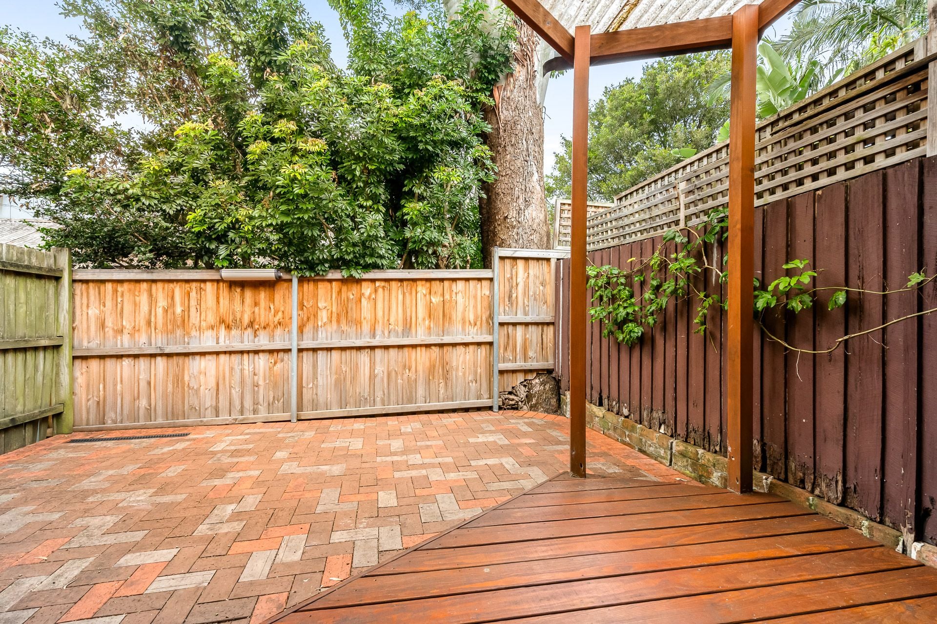 Private and sunny entertaining rear yard with deck and pergola, surrounded by greeneries.